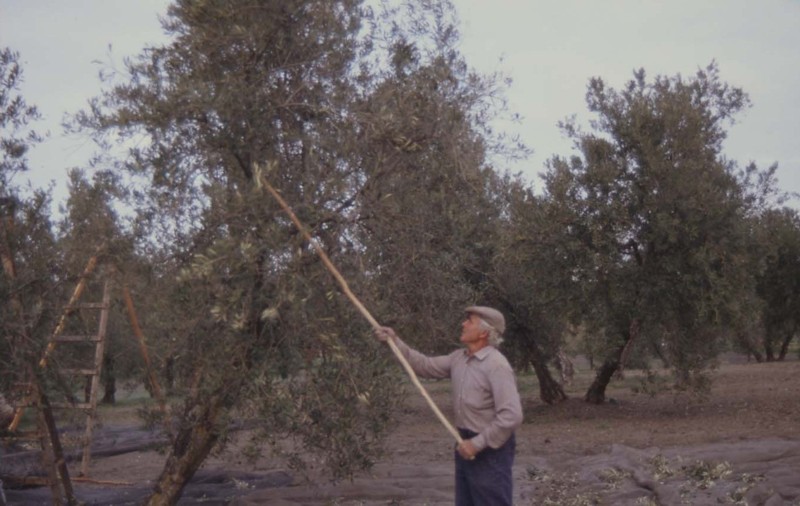 ![]() Recogida por ordeño al final del verano-otoño. Las aceitunas se recogen a mano echándose en una cesta que se denomina macaco. Para recolectar las zonas altas se recurre a una especie de escalera llamada banco. |