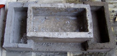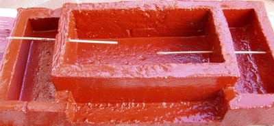 Tras sellar la unión de los moldes con silicona, rellenamos con hormigón fino, evitando la formación de bolsas de agua mediante la introducción de un palillo. |