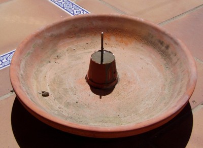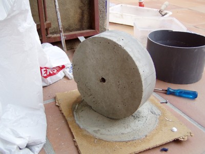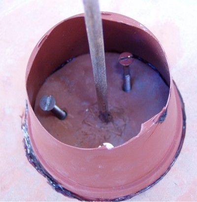 por lo que decidimos reforzar la base. Para ello taladramos la base de cerámica en tres lugares y colocamos tornillos que la atravesaban y se atornillaban en la madera. Una maceta de plástico nos sirvió de molde para crear el tronco de cono que servirá de refuerzo al eje. |