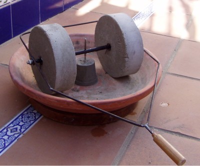 Probando la distancia entre las muelas y su giro en la solera, que será una bandeja de cerámica. |