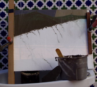 | Paso 5.- Rellenado con cemento-cola del espacio que queda entre las láminas de vidrio. |