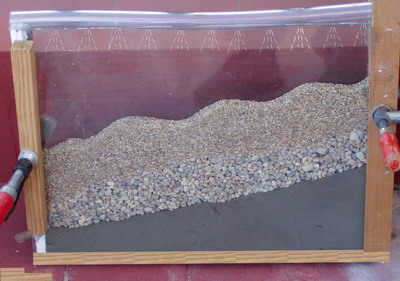 | Montaje provisional con gravilla y arena. Se señala la simulación de lluvia o riego en el tubo de la parte superior. | ![]() |