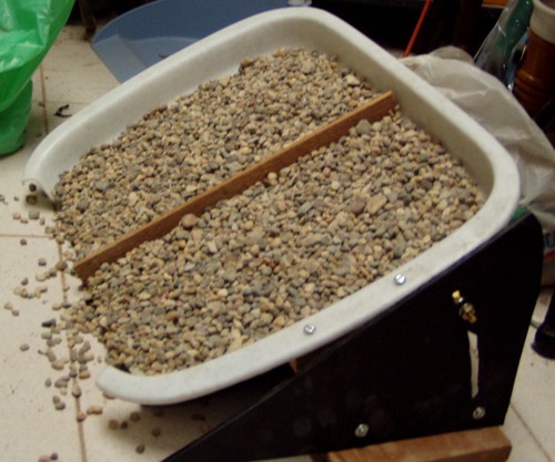 gravilla pegada sobre la bandeja. Será necesario reforzar la bandeja, ya que cede al peso de la grava. Pegaremos una lámina de <DM> por debajo. |