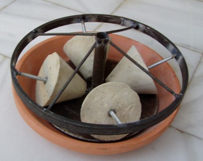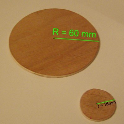 Medidas para las piedras de molino. Radio base mayor = 60 mm Radio base menor = 16 mm Generatriz cono completo = 14 cm Generatriz cono pequeño (base pequeña)= 4 cm Ángulo =154.3º |