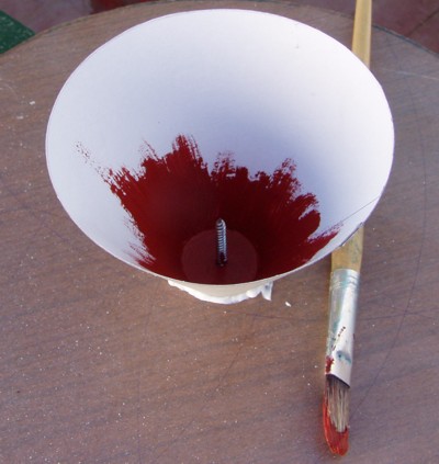 Sobre el molde de cartón plastificado encajamos el primitivo molde de plástico. Atornillamos el eje desde abajo y añadimos un alambre retorcido para aumentar la resistencia a la fractura. |