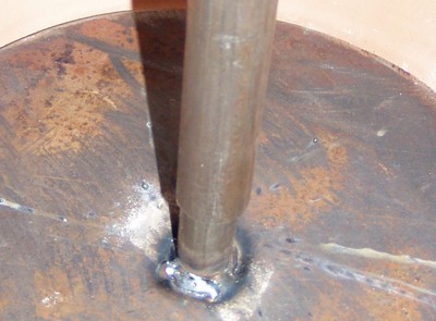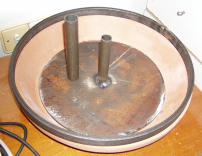 La base del molino es metálica para que el eje pueda fijarse mejor. Junto al eje, soldado a la base, puede verse el tubo al que irán soldados los ejes de las piedras. |