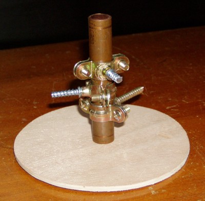 En esta base atornillamos el eje en el que previamente habíamos introducido en el eje un taco de plástico. Sobre el eje fijamos unos anclajes metálicos que quedarán incluidos en el mortero. |