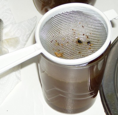 Aspecto del papel después de filtrar medio litro de aceite. En el recuadro puede verse un detalle del material eliminado tras el lavado del filtro. |