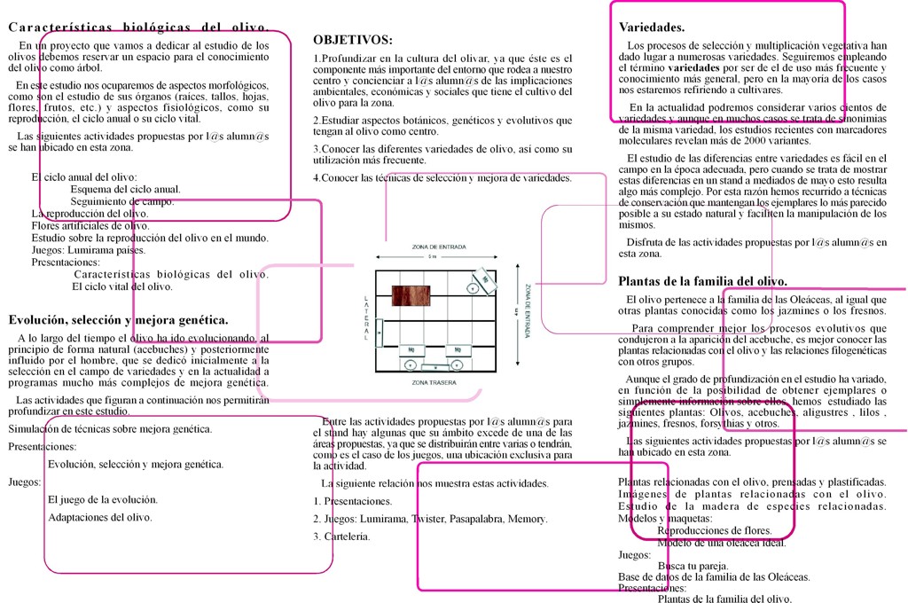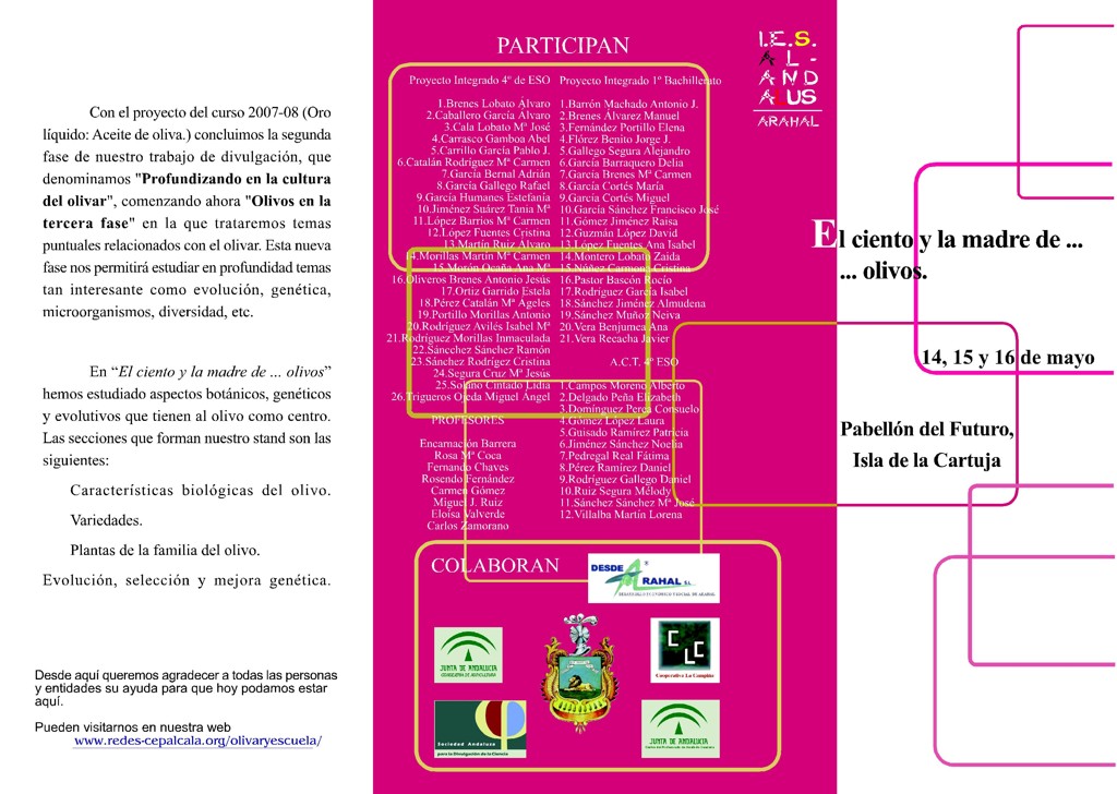 ____Desde la primera edición de la Feria de la Ciencia nos hemos dedicado al estudio del olivar. Inicialmente lo estudiamos de forma global, y durante los cuatro últimos cursos hemos profundizado en aspectos históricos, en su cultivo y en los temas más intersantes desde el punto de vista económico y social, es decir, la aceituna de mesa y el aceite de oliva. Este curso comenzamos otro proyecto que denominaremos en su conjunto “Olivos en la tercera fase”, en el que nos dedicaremos a profundizar en temas mucho más puntuales del olivar, comenzado este estudio con el proyecto “El ciento y la madre de ... olivos”.