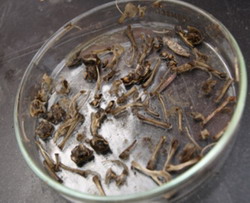 ____Hasta el momento hemos realizado la disección de varias egagrópilas para conocer la técnica y obtener los restos que, una vez limpios, nos servirán para elaborar láminas y preparaciones que podrán ser observadas por los visitantes de nuestro stand. Además hemos realizado una presentación que servirá a nuestros compañeros, y a todas las personas que visiten nuestra página, a saber más sobre nuestro trabajo.