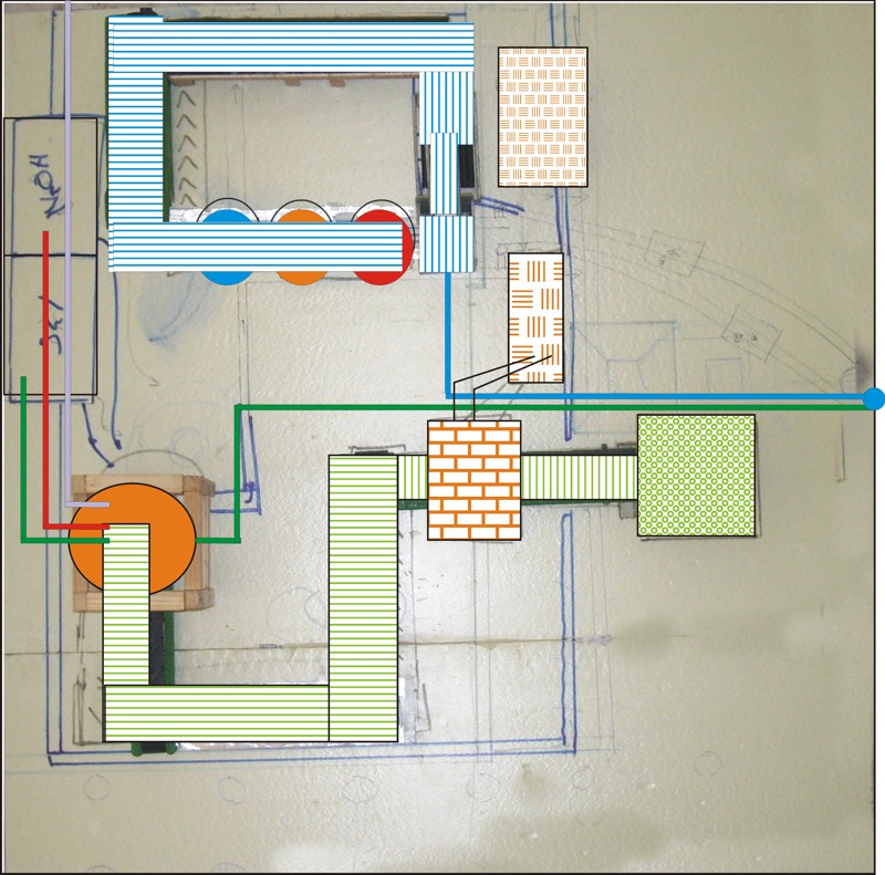 | Superposición del gráfico inicial del recorrido del juego sobre el replanteo de la maqueta de la planta entamadora. | |