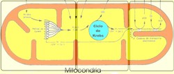 Esquema de una mitocondria donde se resumirá la respiración (ciclo de Krebs y cadena transportadora de electrones). |