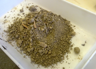 Una vez en el laboratorio, vertimos la tierra en un matraz con agua, lo agitamos y lo dejamos decantar 1 ó 2 días. Le hemos echado agua para humedecer la arena ya que en seco los protozoos estarán inmóviles e incluso enquistados como forma de resistencia. |
