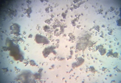 Aunque en el suelo seco es posible encontrar pequeños animales lo más probable es que no veamos nada, salvo restos minerales. Después de uno o dos días cogimos una pequeña muestra de la disolución, la colocamos en un portaobjetos para observarla en el microscopio y al observar que sólo había bacterias, repetimos la misma experiencia pero la tierra era de otro olivar, para intentar observar protozoos. |