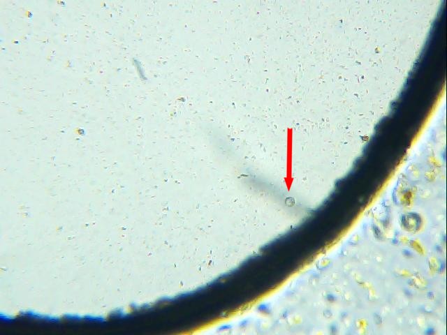 | Debido a la poca calidad de las imágenes, que fueron tomadas con un microscopio escolar, y a la ausencia de movimiento, no es posible observar directamente los protozoos. Las flechas nos indican su posición. Esperamos obtener imágenes de más calidad, aunque en el stand no existirá ese problema, ya que los visitantes podrán verlos directamente en el microscopio. | |