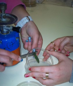 una placa de Petri, cerca de una bombona encendida para evitar contaminaciones.