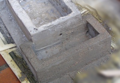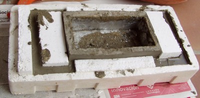 Tras sellar la unión de los moldes con silicona, rellenamos con hormigón fino, evitando la formación de bolsas de agua mediante la introducción de un palillo. |