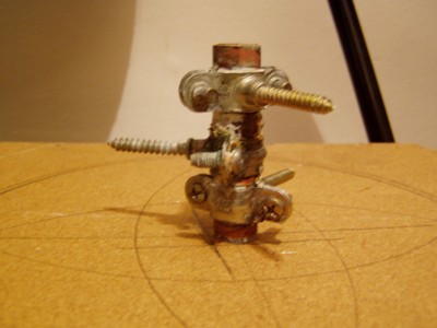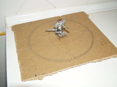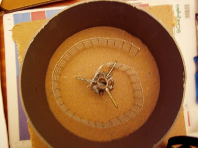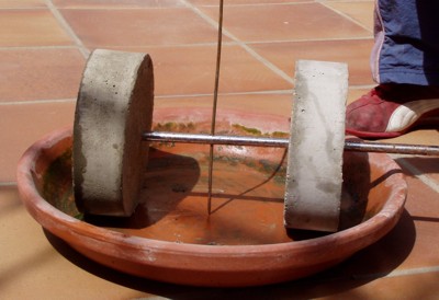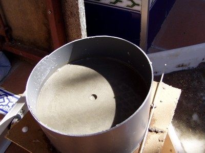 por lo que decidimos reforzar la base. Para ello taladramos la base de cerámica en tres lugares y colocamos tornillos que la atravesaban y se atornillaban en la madera. Una maceta de plástico nos sirvió de molde para crear el tronco de cono que servirá de refuerzo al eje. |