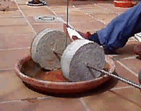 Probando la distancia entre las muelas y su giro en la solera, que será una bandeja de cerámica. |