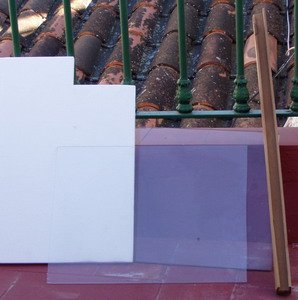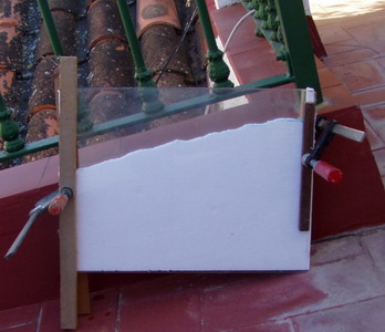 | Paso 3.- Montar el poliexpan entre las láminas de vidrio y fijar con gatos de carpintero.. |