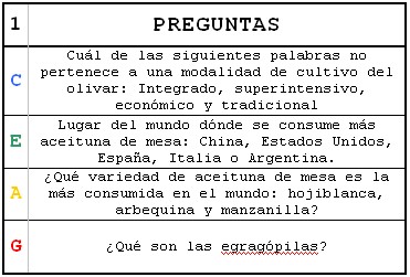 - El tablero se divide en cuatro secciones: modalidades de cultivo (C), estadística (E), tipos de aceitunas (A) y general (G). En cada una de estas secciones se harán preguntas específicas.