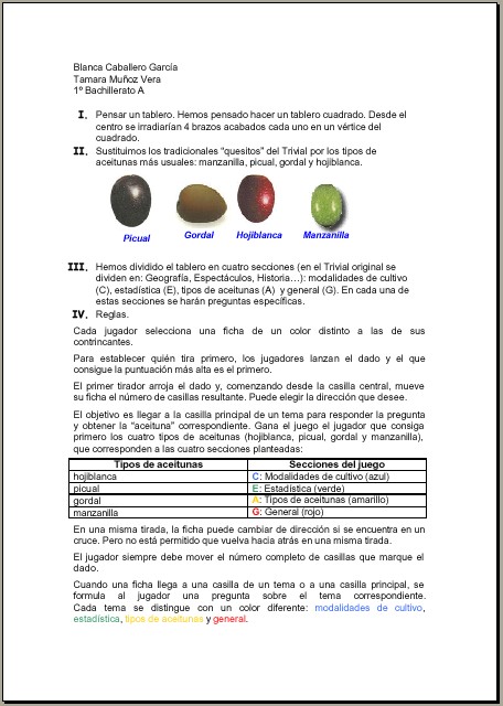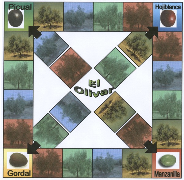 - Sustituimos los tradicionales quesitos del Trivial por los tipos de aceitunas más usuales: manzanilla, picual, gordal y hojiblanca.