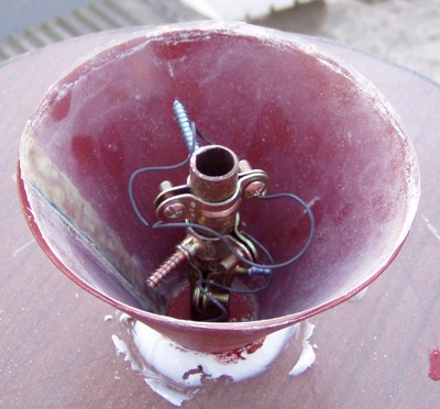 Sobre el molde de cartón plastificado encajamos el primitivo molde de plástico. Atornillamos el eje desde abajo y añadimos un alambre retorcido para aumentar la resistencia a la fractura. |