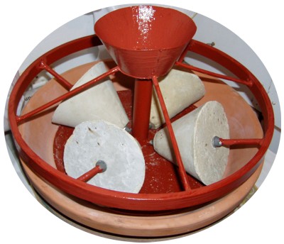 En esta imagen podemos ver el molino completamente acabado. Hemos aprovechado el molde cónico, con el que hicimos las muelas, para fabricar la tolva superior. |