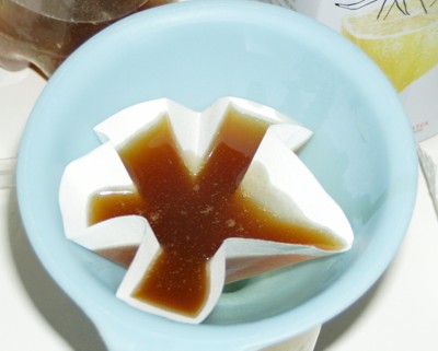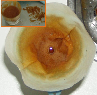 Aspecto del papel después de filtrar medio litro de aceite. En el recuadro puede verse un detalle del material eliminado tras el lavado del filtro. |