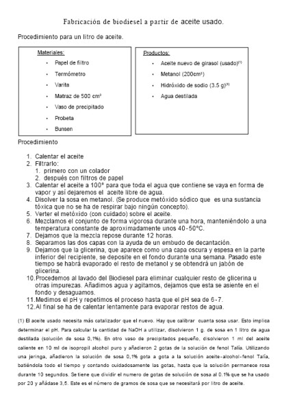 ____En la actualidad es frecuente que nos encontremos ese nuevo combustible en los surtidores. Realmente es una mezcla (15-30%) del producto que aquí se describe con el gasoil tradicional. Describimos a continuación el proceso de fabricación a partir de aceite sin usar y próximamente incluiremos las técnicas preparatorias necesarias para el aceite usado.