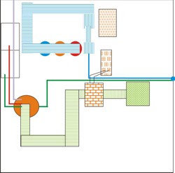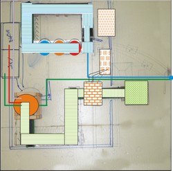 | Superposición del gráfico inicial del recorrido del juego sobre el replanteo de la maqueta de la planta entamadora. | |