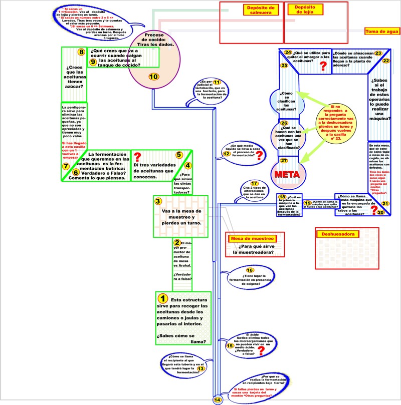 ¿Cómo se clasifican las aceitunas? Si no respondes a la pregunta correctamente vas a la deshuesadora, pierdes un turno y después vuelves a la casilla nº 23. |