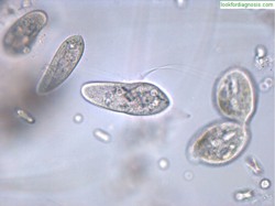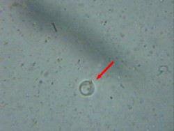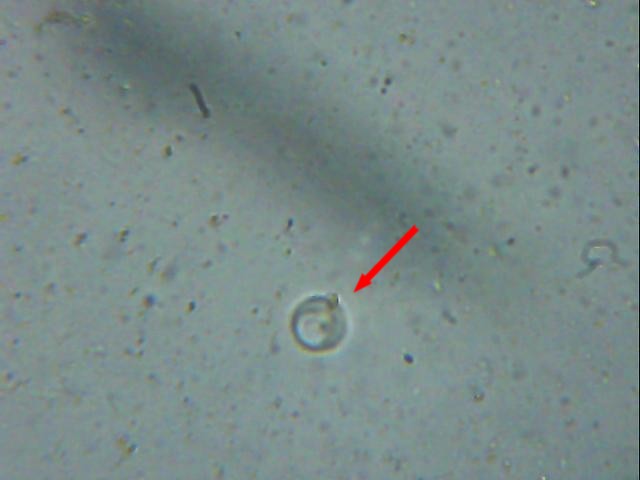 | Debido a la poca calidad de las imágenes, que fueron tomadas con un microscopio escolar, y a la ausencia de movimiento, no es posible observar directamente los protozoos. Las flechas nos indican su posición. Esperamos obtener imágenes de más calidad, aunque en el stand no existirá ese problema, ya que los visitantes podrán verlos directamente en el microscopio. | |