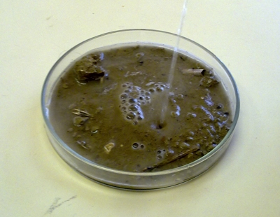 Una vez en el laboratorio, vertimos la tierra en un matraz con agua, lo agitamos y lo dejamos decantar 1 ó 2 días. Le hemos echado agua para humedecer la arena ya que en seco los protozoos estarán inmóviles e incluso enquistados como forma de resistencia. |