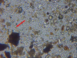 y cogimos la disolución (el agua) para centrifugarla. Una vez que la centrifugamos, todas las partículas arcillosas estaban concentradas en el fondo del tubo de ensayo. Retiramos la mayor parte del agua. Con el agua que quedó, concentramos las partículas que quedaron tras haber centrifugado la muestra y miramos esta nueva disolución, más concentrada, en el microscopio. Al mirar en el microscopio pudimos ver protozoos, debido a la alta concentración de la muestra. |