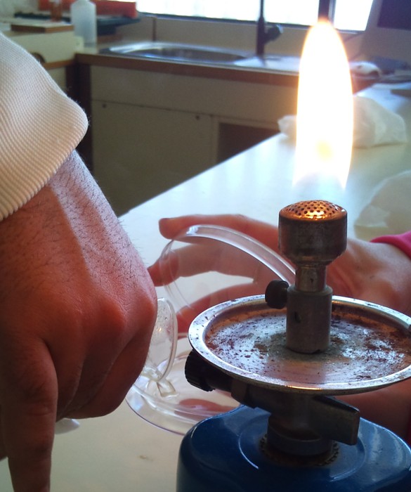 una placa de Petri, cerca de una bombona encendida para evitar contaminaciones.