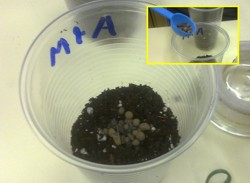El día 9/3/11 iniciamos la experiencia que marcaremos como "Experimento A. Colocación de las micorizas (*) en el fondo. aproximadamente 8/10 granos.