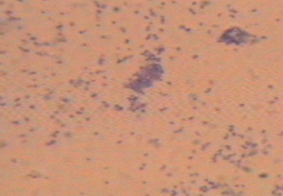 | Tras el primer paso de la tinción de Gram (II).